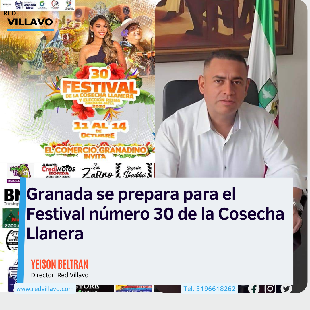 El municipio de Granada, Meta, está listo para celebrar el 30° Festival de la Cosecha Llanera, un evento que resalta la riqueza cultural de la región del Ariari. Desde el 10 de octubre, con un gran despliegue de seguridad y apoyo de las autoridades locales y departamentales, los asistentes podrán disfrutar de actividades como desfiles de carrozas, colonias regionales y la presencia de países invitados como México, Argentina y Brasil. Además, habrá conciertos con artistas como el Charrito Negro, Rafael Santos y Maggie Juan, entre otros, y eventos como Joropovía, Car Audio y motocross.