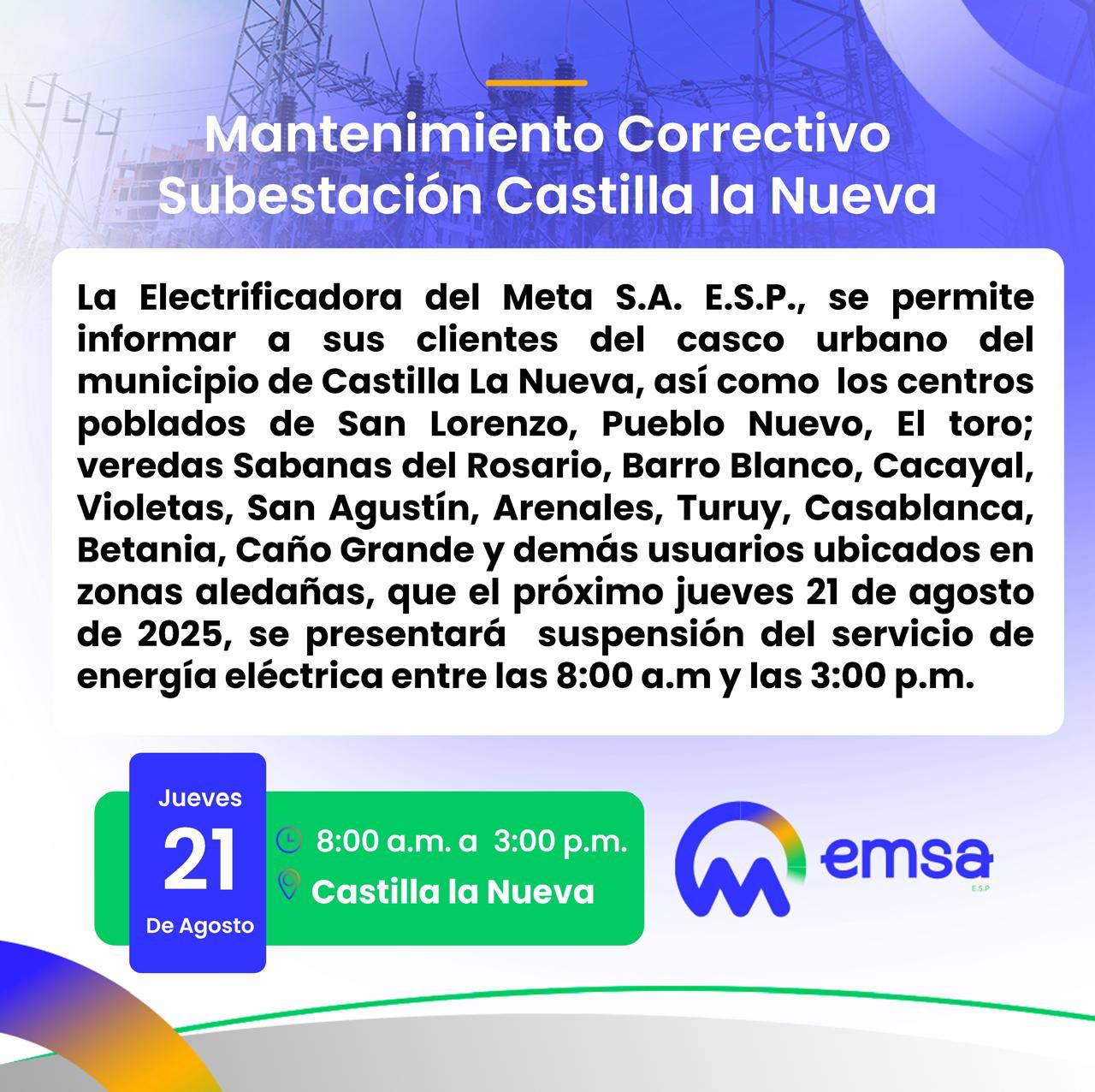 La Electrificadora del Meta S.A. E.S.P., se permite informar a sus clientes del casco urbano del municipio de Castilla La Nueva, así como los centros poblados de San Lorenzo, Pueblo Nuevo, El toro; veredas Sabanas del Rosario, Barro Blanco, Cacayal, Violetas, San Agustín, Arenales, Turuy, Casablanca, Betania, Caño Grande y demás usuarios ubicados en zonas aledañas, que el próximo jueves 21 de agosto de 2025, se presentará suspensión del servicio de energía eléctrica entre las 8:00 a.m y las 3:00 p.m.