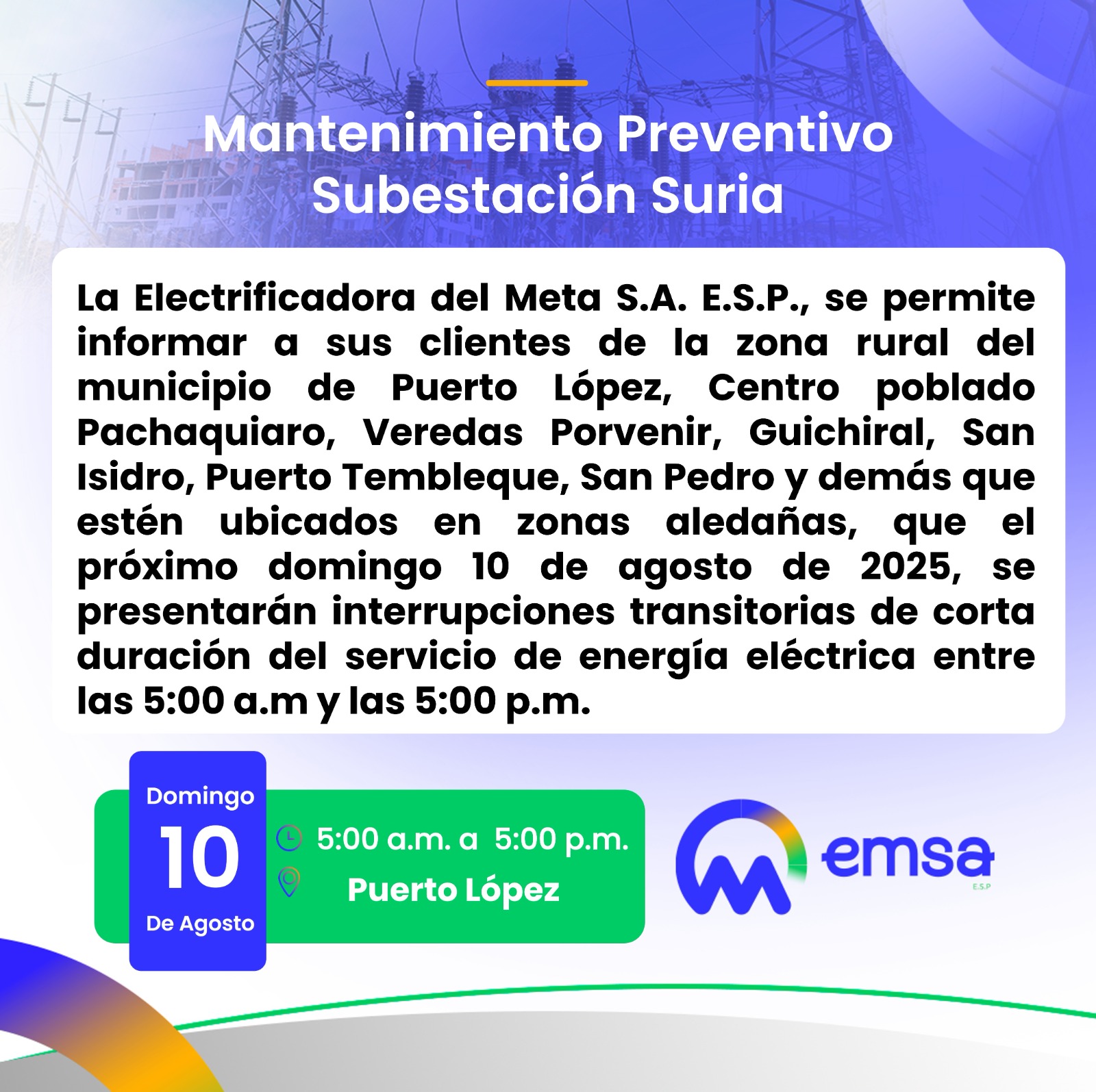 La Electrificadora del Meta S.A. E.S.P., se permite informar a sus clientes de la zona rural del municipio de Puerto López, Centro poblado Pachaquiaro, Veredas Porvenir, Guichiral, San Isidro, Puerto Tembleque, San Pedro y demás que estén ubicados en zonas aledañas, que el próximo domingo 10 de agosto de 2025, se presentarán interrupciones transitorias de corta duración del servicio de energía eléctrica entre las 5:00 a.m y las 5:00 p.m.