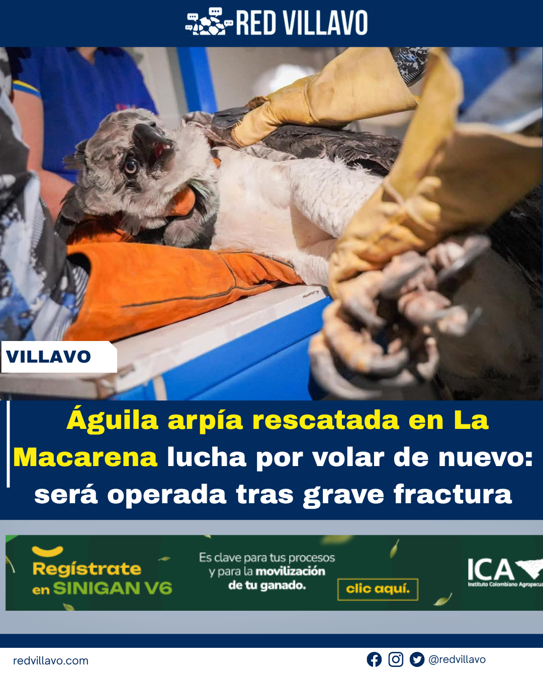 Un águila arpía fue rescatada en zona rural de La Macarena tras ser hallada con una lesión en su ala derecha. La atención inicial permitió su traslado a Villavicencio, donde especialistas confirmaron una fractura que requiere cirugía.